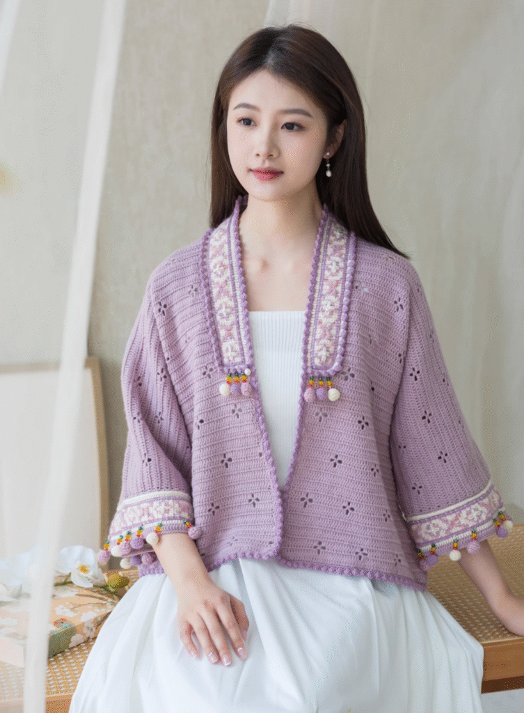 The cuffs and placket feature classic silhouettes and motifs, elegantly accentuated with modern tassel details—blending heritage and fashion in perfect harmony.