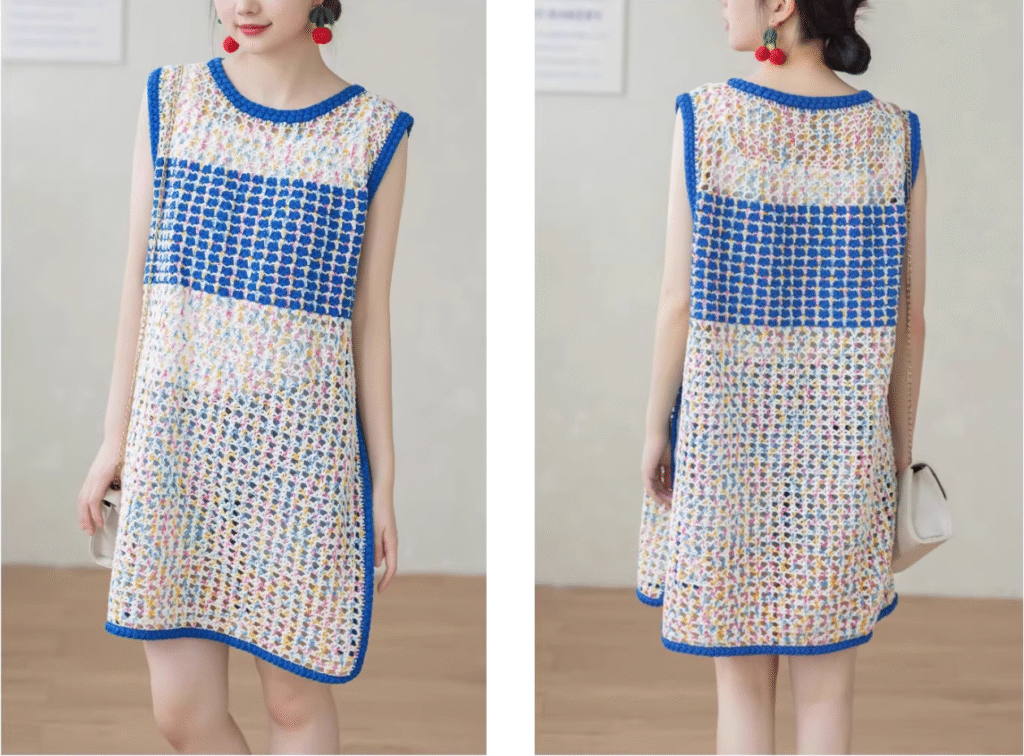 The three-dimensional handmade crochet motif interplays with traditional key patterns, and infusing everyday style with timeless sophistication.